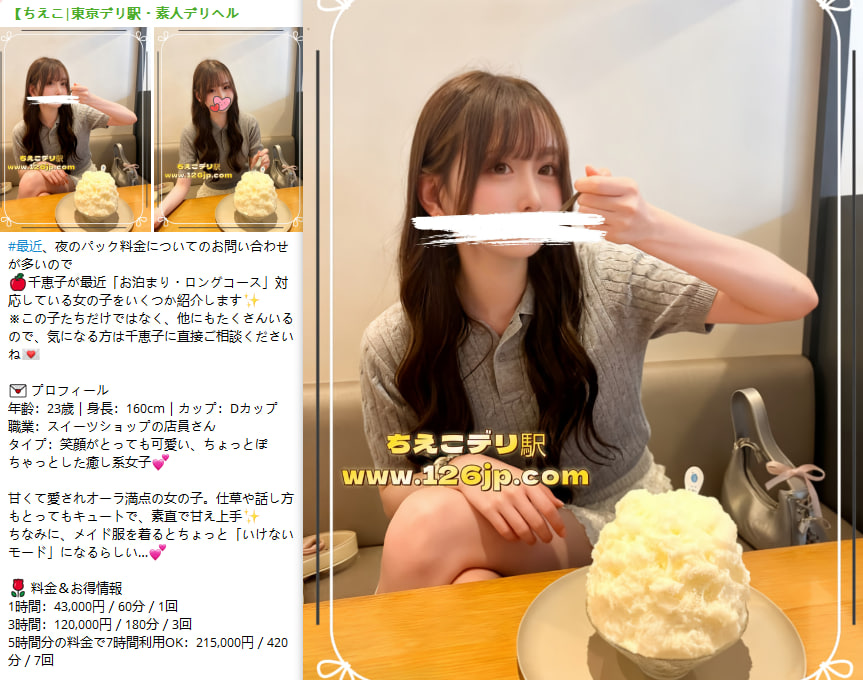 一枚の写真から、あなたの夜が始まる——。こんにちは、初めまして。デリバリーのご紹介をしております。修正なし本人写真から自由に選択 可能。ご満足後のお支払いで安心、初めての方も誠実かつ安全にご利用いただけます。徹底した健康管理で衛生面も保証。ホテル・ラブホテル・ご自宅対応。完全予約制&匿名予約OK、プライバシー厳守で詐欺の心配も不要です。 検索→「ちえこデリ駅」 ご連絡はLINE:JAV779/TG:@Japan72